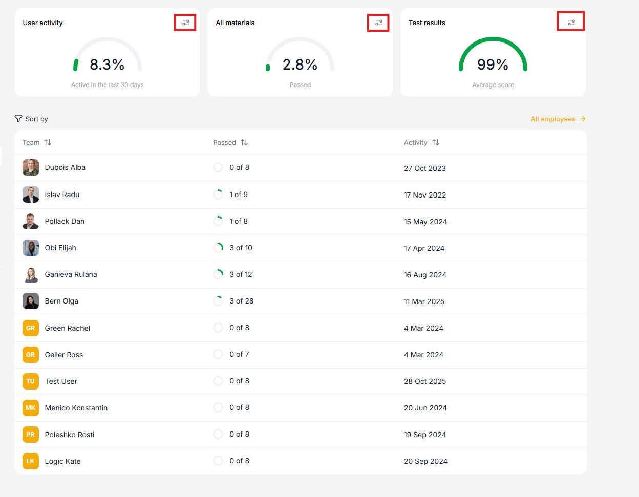 The team result is displayed using three widgets: User activity, All materials, Test results. Moreover, each of them has its own set of filters and sortings, available by clicking on settings (gear in the lower right corner) or the filters icon on the web version.