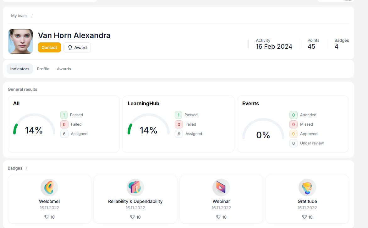 When you go to the user profile, information on the user's results for all materials and awards is displayed. You can use the Filter to select only required materials and also the desired study duration parameter.
