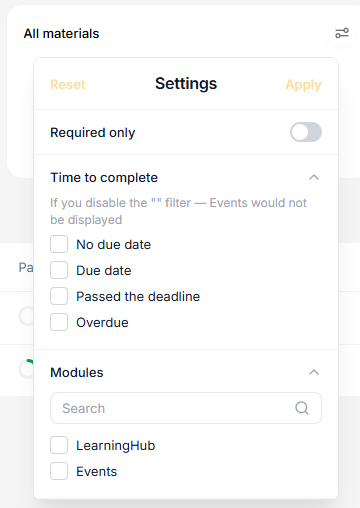 Important: Filters set within a user profile are not linked to the Team Results widget settings (for example, the "Not completed on time" filter may be set in the team results, while "Completed on time" may be selected in the user's materials filter).
