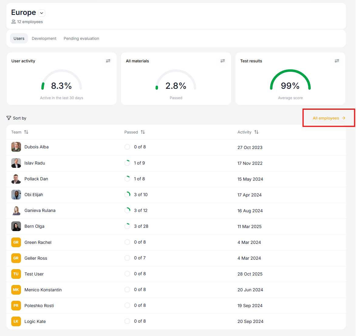 In the "My Team" section , in the "Users" subsection, a manager can monitor the dynamics of their subordinates' training using generalized pie charts, as well as detailed information for each user when going to their profile.