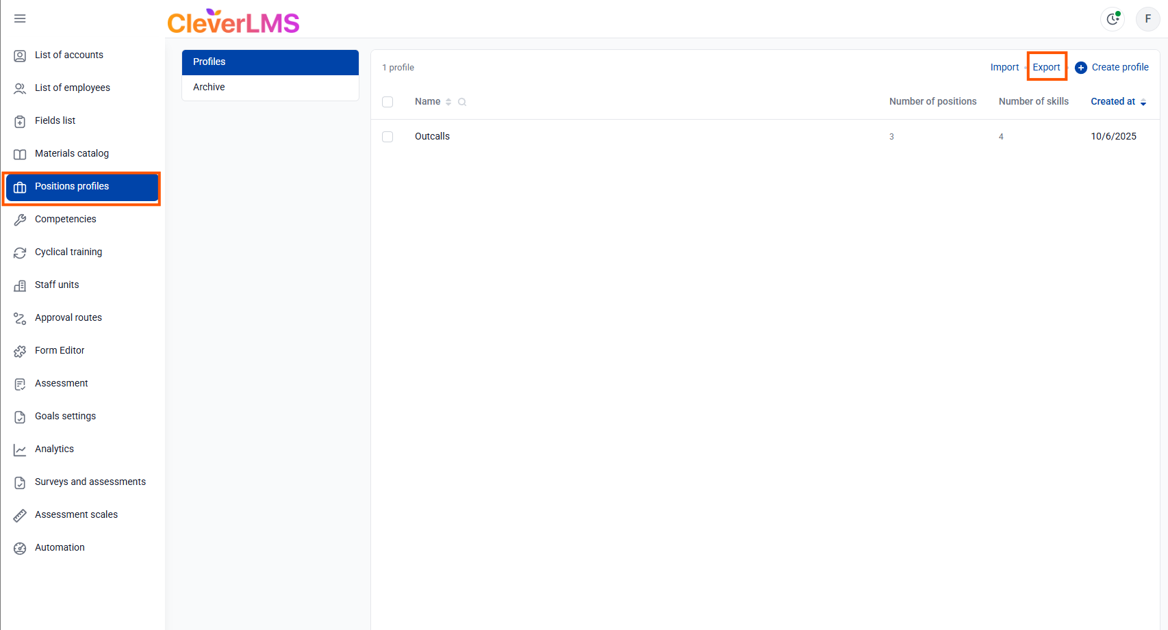 If necessary, you can archive outdated job profiles ( Select using the checkbox => Actions => Archive ), and also download information on current profiles using the Export function .
