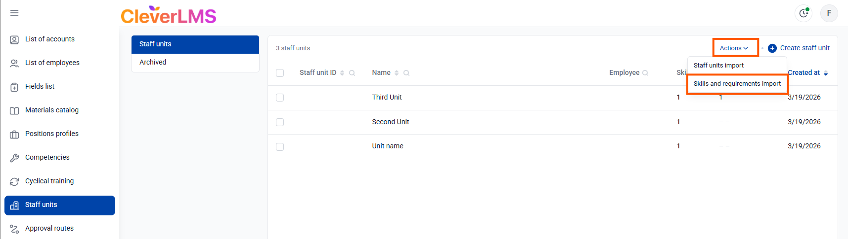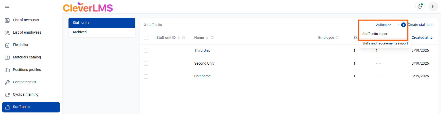 1. Click " Actions " in the upper right corner of the screen and select " Import staff units ";