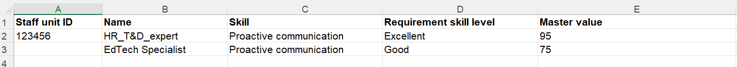 Filling out the file to import skills and requirements for a staffing position: