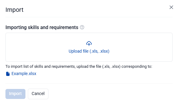 - In the window that opens, download the Example.xlsx file and fill it with data on skills and requirements for them within the framework of staffing units;