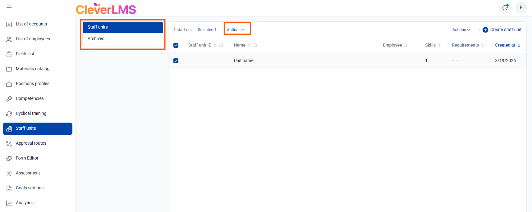 If necessary, you can filter and sort their display, and also use bulk actions to transfer staff units to archived status.