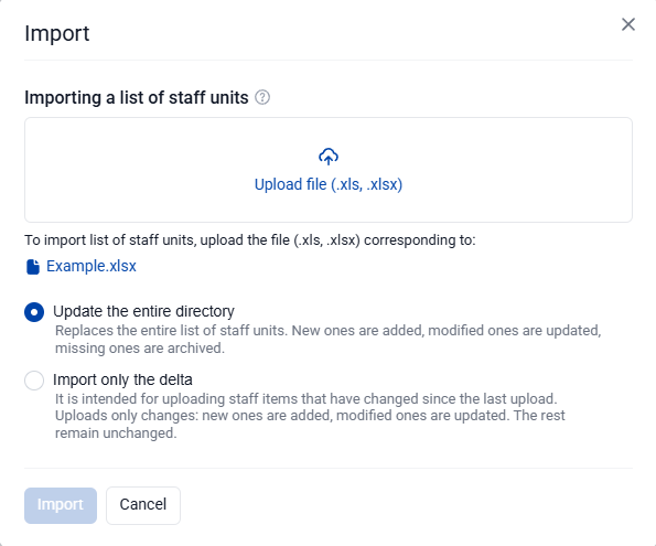 2. In the window that opens, download the Example.xlsx file and fill it with data on the staffing units being added.