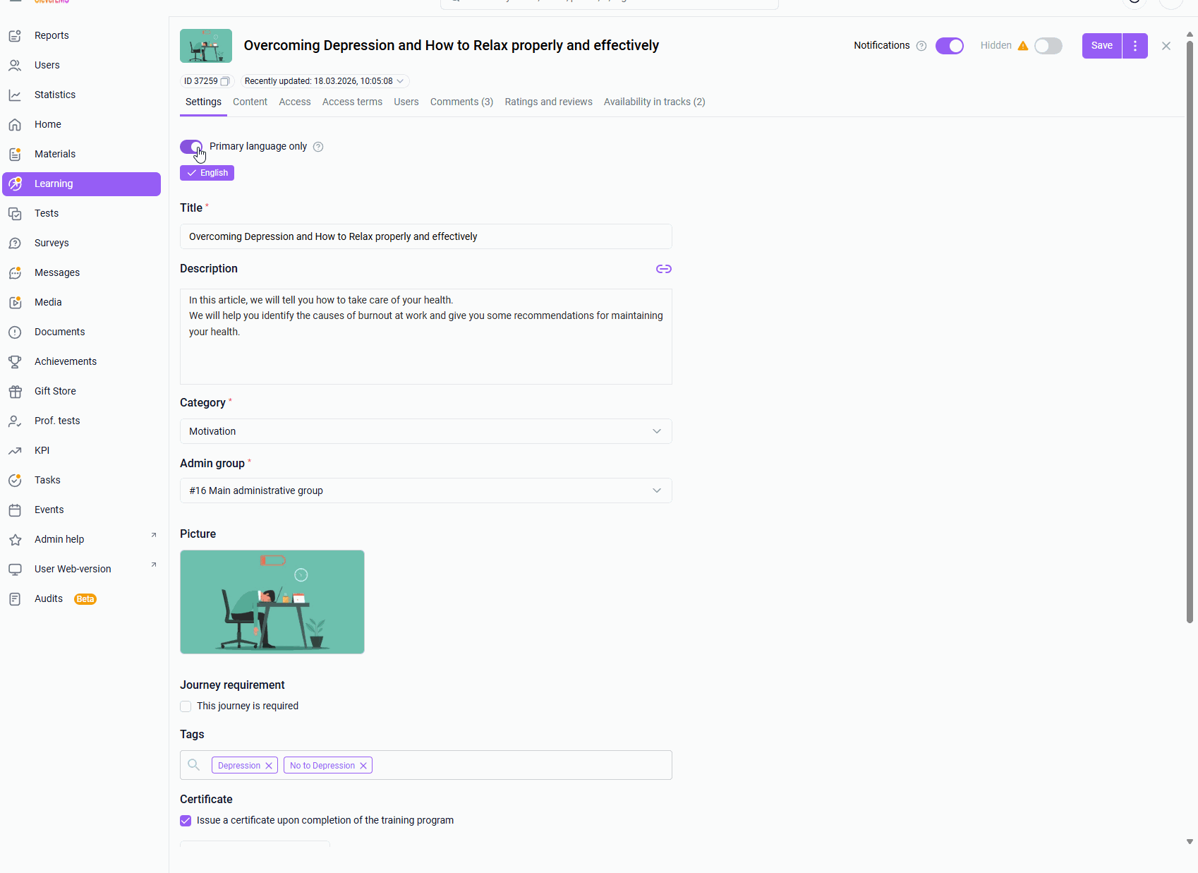This will significantly save administrators time when creating content, simplify the management of training content, while maintaining a familiar user experience—they will continue to see the content in their preferred language if the information was filled in, and if translation is not required, a version in the company's primary language is displayed.